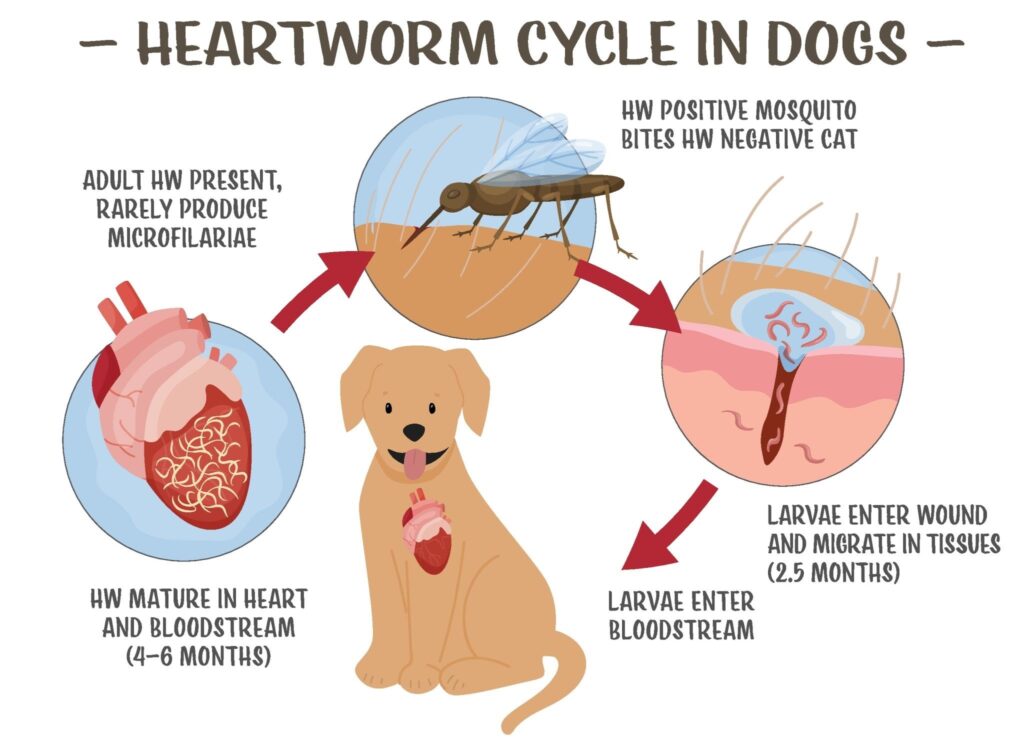 Heartworm is transmitted by mosquitoes and is one of the most serious parasitic diseases affecting dogs. Once mature, heartworms live in the heart and lungs, causing irreversible damage.